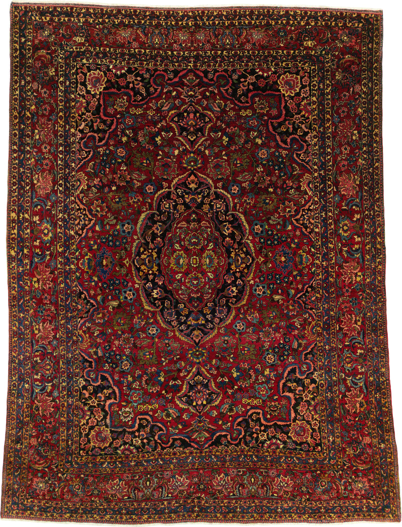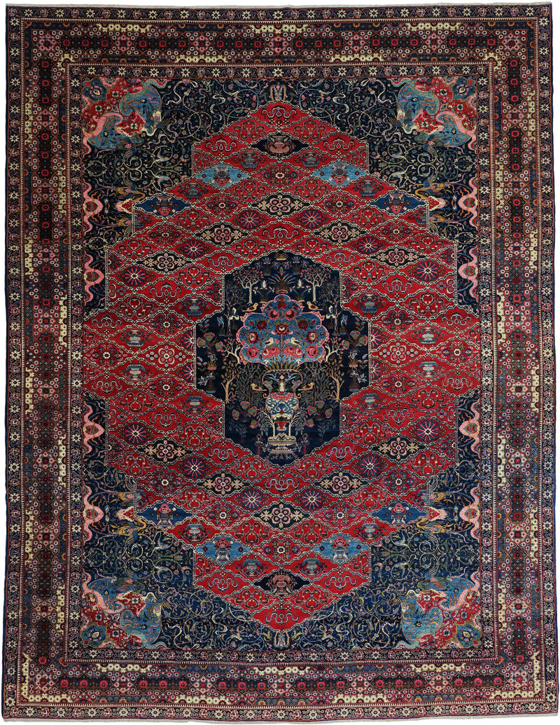 Antique Persian Bakhtiar Rug Circa 1920 | 10' 10" X 14' 1" | Red & Midnight Blue Colours | Tribal Production