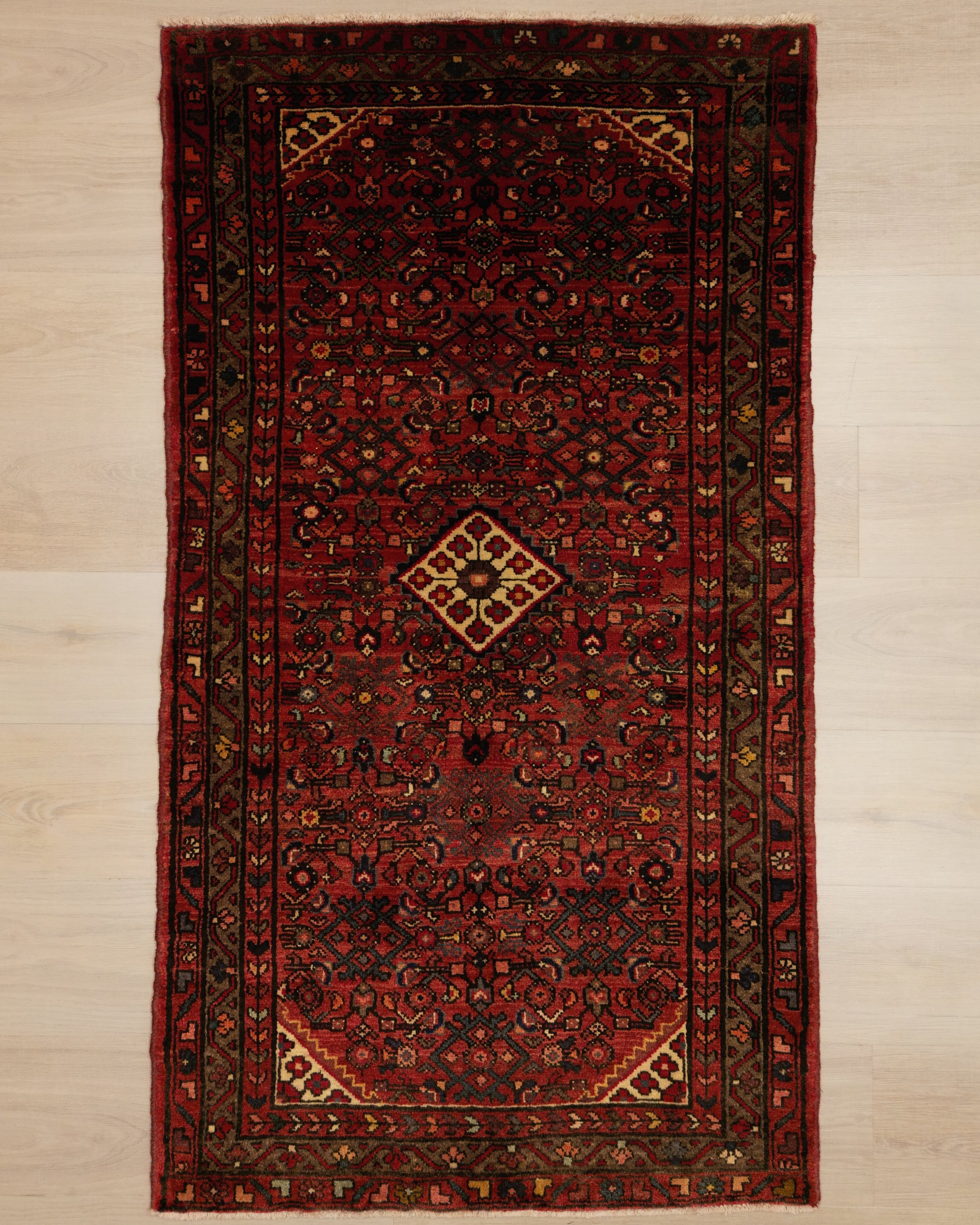 Persian Hamadan Husseinabad Rug | 3' 6" X 6' 4" | Red Colour | Geometric Design | Tribal Production