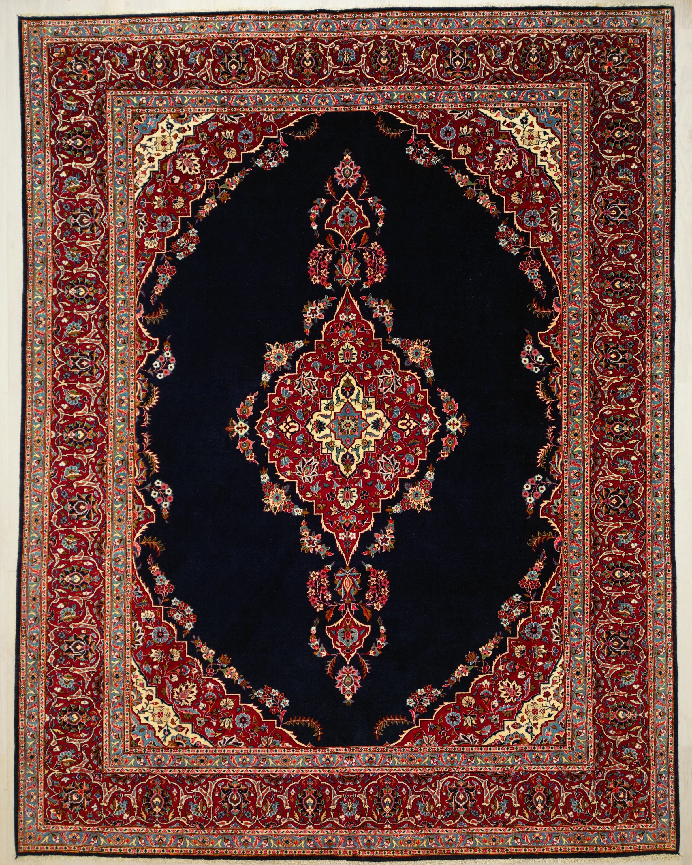 Persian Kashan Rug | 8' 12" X 11' 8" | Midnight Blue & Red Colours | Medallion Design | Urban Production