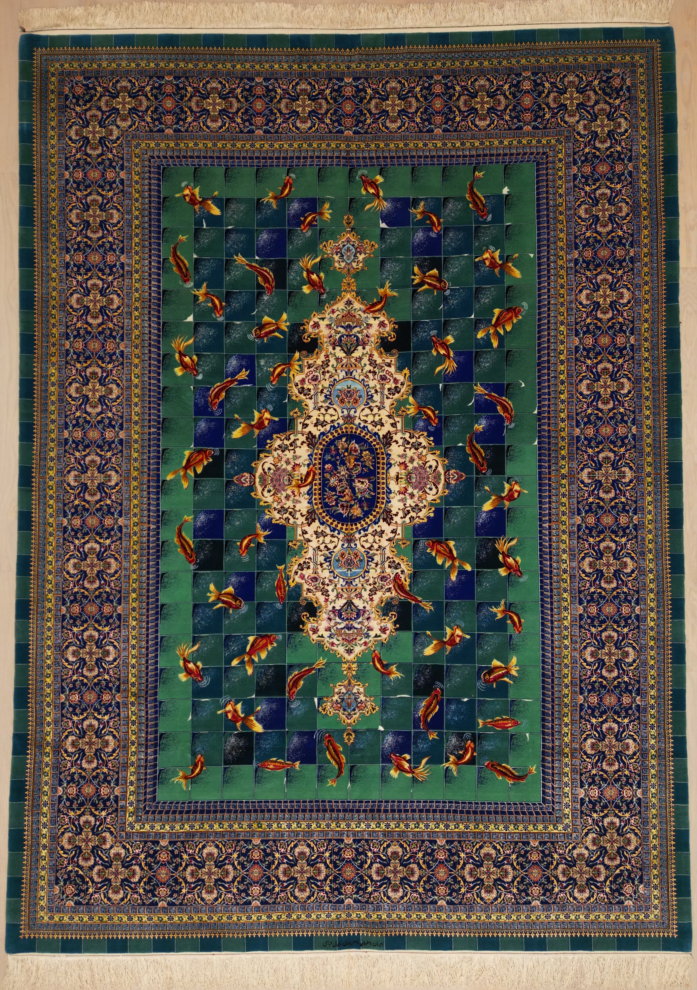 Persian Isfahan Rug | 8' 2" X 11' 2" | Wool & Silk | Extremely Fine | Aqua Colour | Fish Pond Design | Urban Production