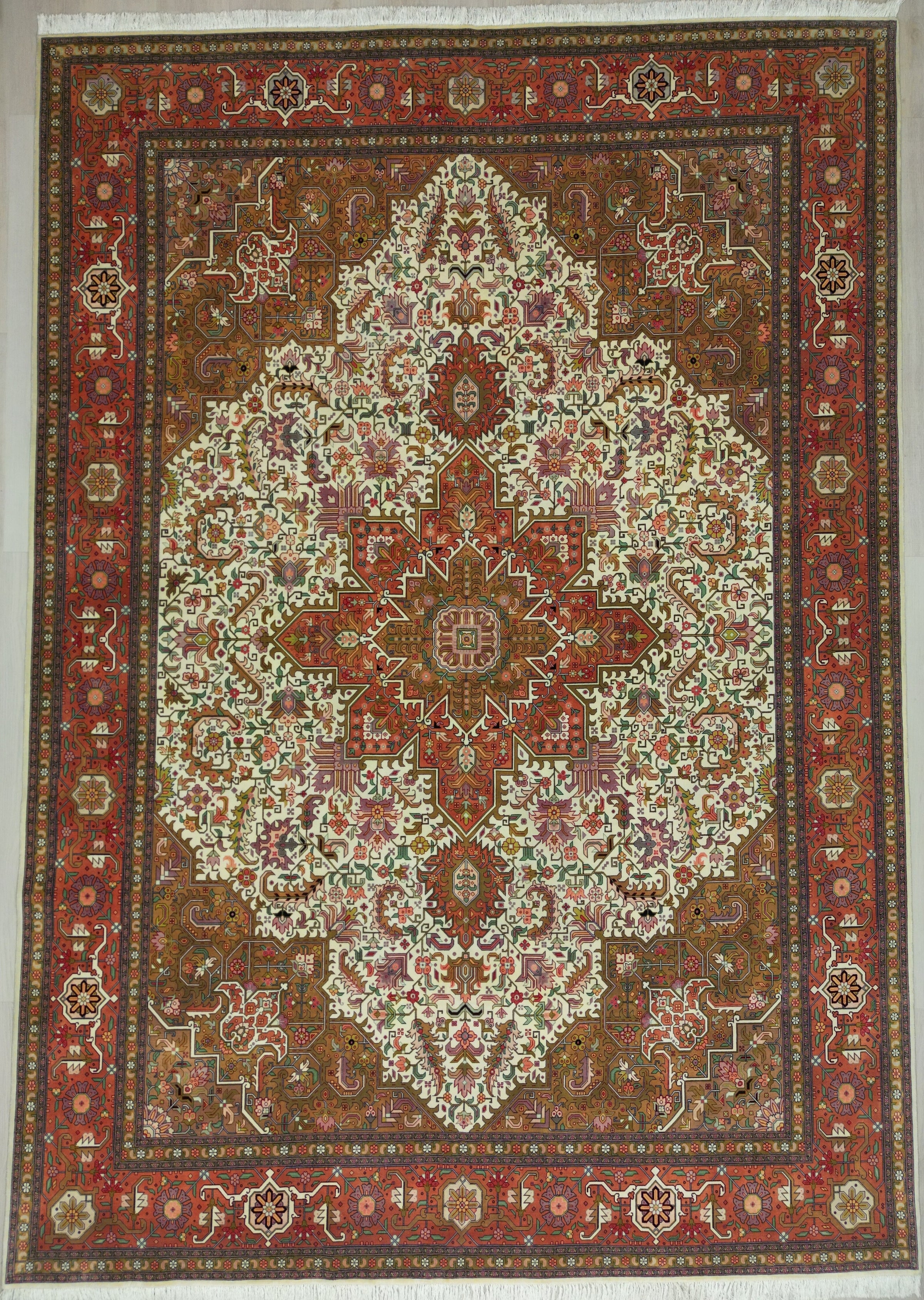 Persian Tabriz Rug | 10' 0" X 14' 3" | Cream & Coral Colours | Heriz Geometric Medallion Design | Urban Production