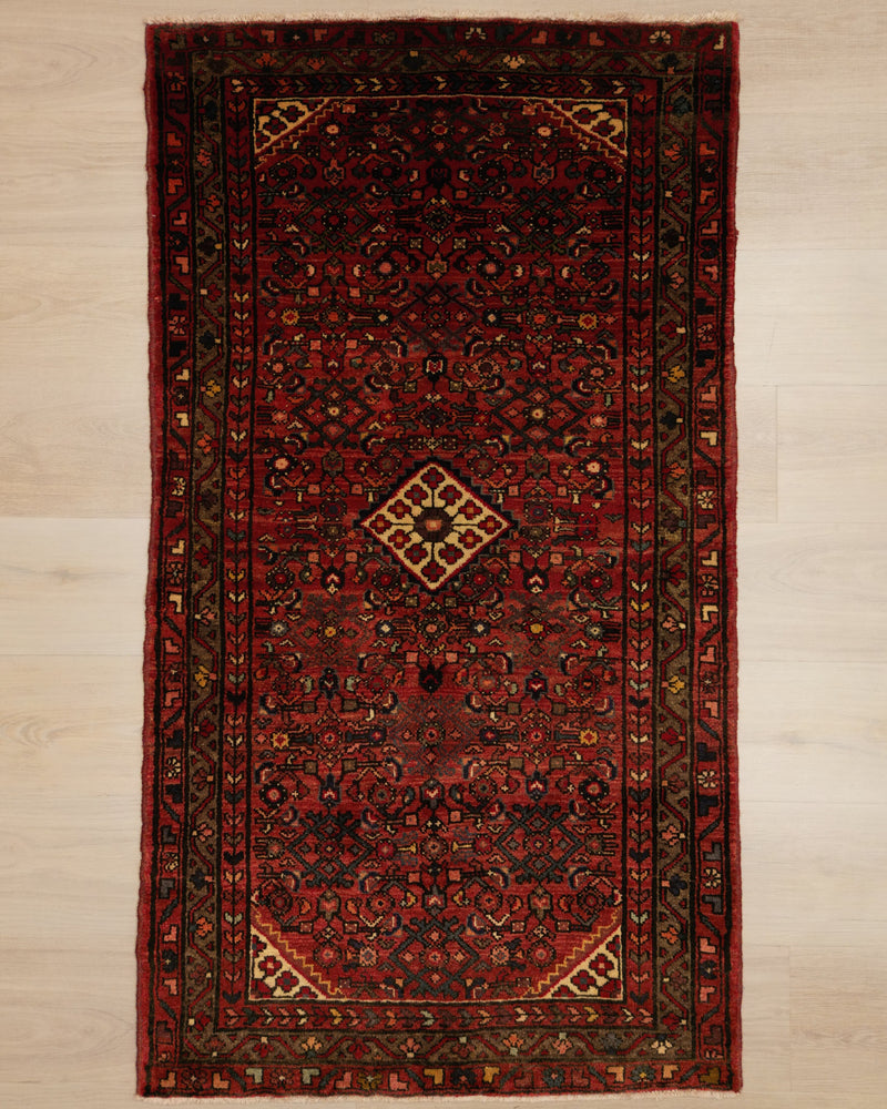Persian Hamadan Husseinabad Rug | 3' 6" X 6' 4" | Red Colour | Geometric Design | Tribal Production
