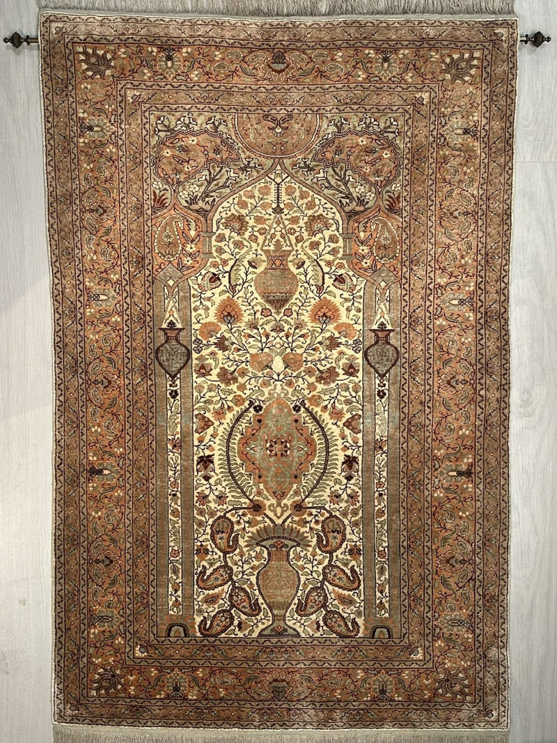 Vintage Turkish Kayseri Rug Circa 1960 | 2' 11" X 4' 4" | Pure Silk | Light Colours | Vase/Mihrab Design | Urban Production