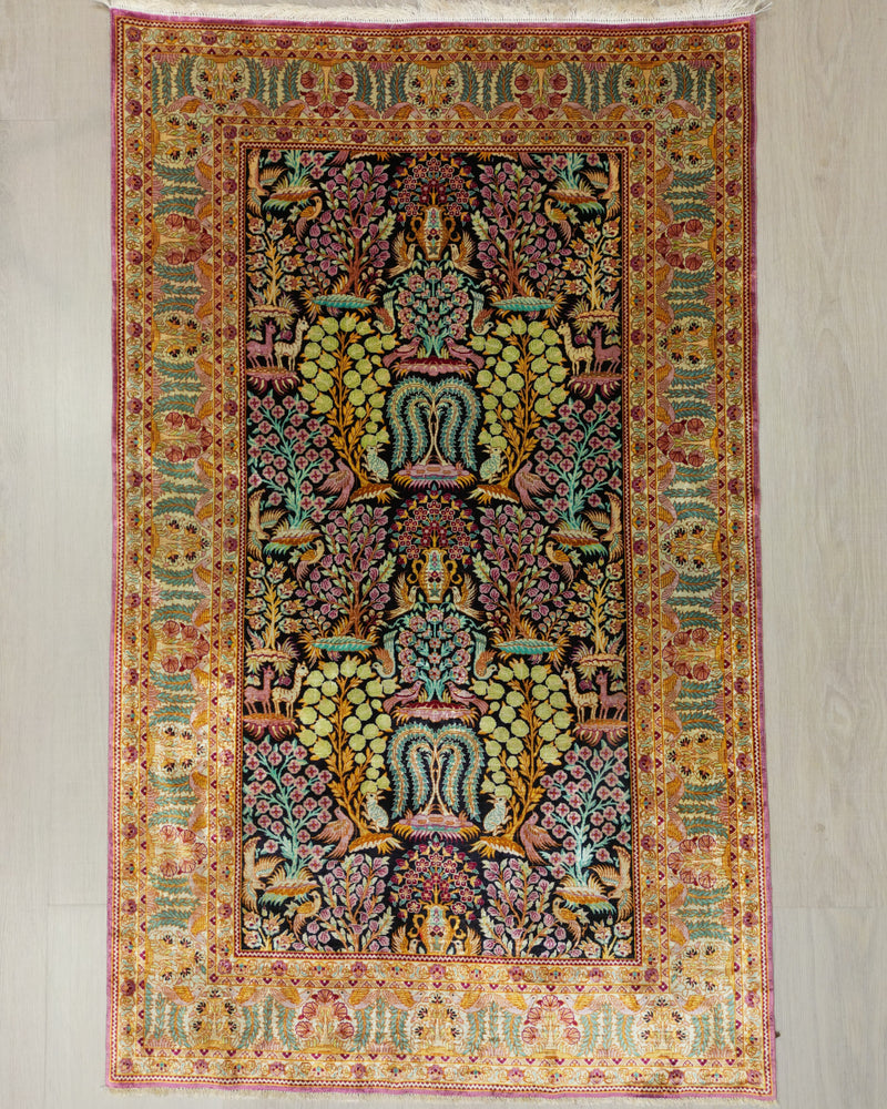 Persian Qom Rug | 3' 1" X 4' 12" | Pure Silk | Multicolour | Flora & Fauna Design | Urban Production