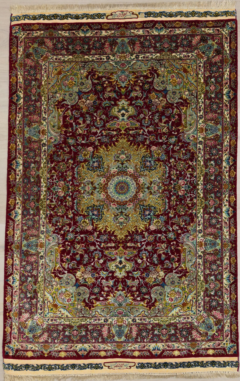 Vintage Persian Isfahan Rug Circa 1950 | 3' 5" X 5' 2" | Exclusive | Floral Design | Burgundy & Blue Colours | Pure Silk | Extremely Fine | Urban Production