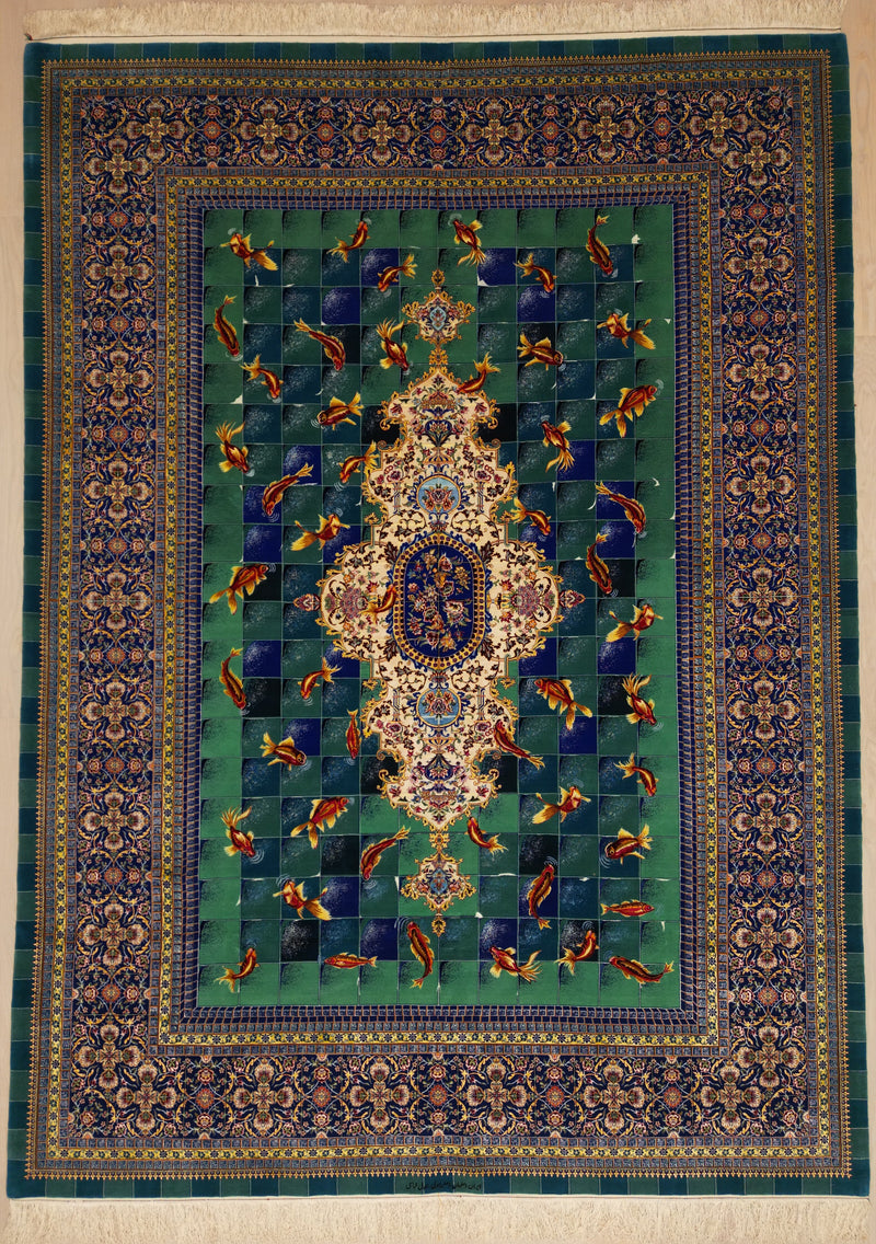Persian Isfahan Rug | 8' 2" X 11' 2" | Wool & Silk | Extremely Fine | Aqua Colour | Fish Pond Design | Urban Production